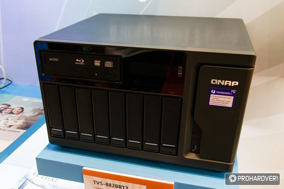 Akinek a TB3-ra igen, az optikai meghajtóra viszont nincs szüksége, annak érdekes ajánlat lehet a TVS-882ST3, ami nyolc darab 2,5”-es meghajtó fogadására képes és Core i5/i7 processzorokkal szerelhető fel. Ez a modell ráadásul két 10 GbE porttal is rendelkezik, így lehetővé teszi a TB3-on keresztül csatlakozó eszközök bekapcsolását a 10 GbE hálózatba is.