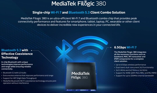 A képességek tekintetében az utóbbit könnyebb részletezni, mivel a Filogic 380 egy Wi-Fi 7 és Bluetooth 5.3 kombó vezérlő, méghozzá egyetlen lapkán belül. A Bluetooth interfész LE Audio képességgel rendelkezik, míg a Wi-Fi 7 modul dupla 2x2-es rádiót kínál a kétsávos egyidejű működéshez. A lapka 2,4, 5 és 6 GHz-es sávokon képes működni, egy csatornán pedig maximum 5 Gbps-os információátviteli teljesítményt kínál, míg MLO mellett elérhető a 6,5 Gbps is.