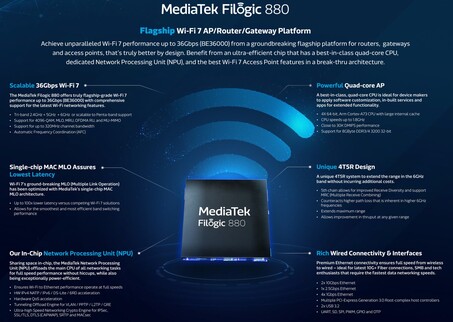 A Filogic 880 jóval potensebb, de ez érthető, hiszen a hálózati eszközöket célozza. A rendszer 36 Gbps-os pentasávos tempóig skálázódik, és egy csatornára levetítve is elérhető a 10 Gbps. Ezen túlmenően támogatott az OFDMA RU, az MU-MIMO és az MBSSID. A Filogic 880-ban a feladatokat egy négymagos ARM Cortex-A73-as processzor végzi, amely ki van egészítve a hálózati processzorával, illetve egy integrált kriptográfiai motorral (EIP-197).
