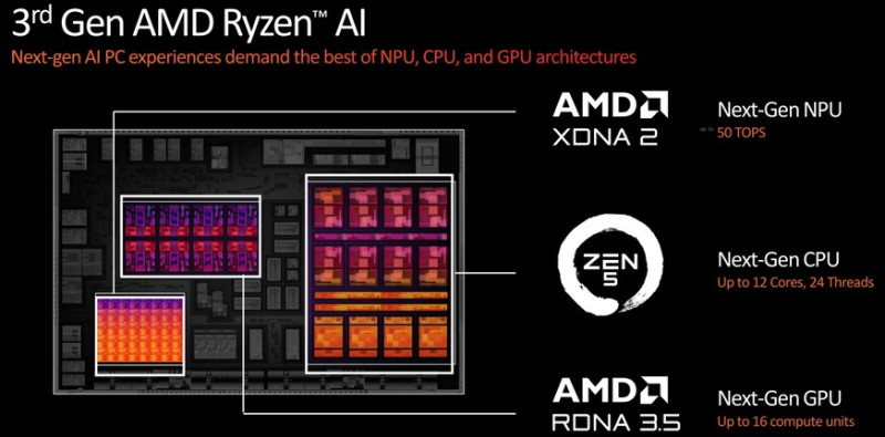 Teljesen megújul az IGP, ugyanis a Strix Point SoC APU megkapja az RDNA 3.5 jelzésű architektúrát,és konkrétan egy 16 CU-s dizájnról van szó, ami az RDNA 3 alapfelépítése alapján megfelel nyolc darab WGP-nek – vagy újabb nevén CUP-nak –, de klasszikus értelemben hivatkozhatunk rájuk multiprocesszorként. Új lesz az NPU is, ami immáron beveti az XDNA2 dizájnt, és ez 50 TOPS teljesítmény leadására képes, vagyis megfelel a Microsoft Copilot+ igényeinek.