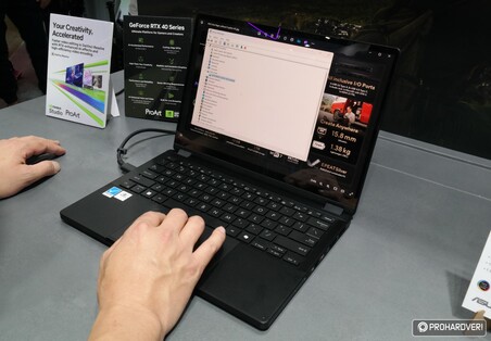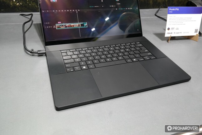 Maradva először a notebookoknál, ezek a P16 és PX13 nevekre hallgatnak, és az AMD Ryzen AI 300 sorozatra épülnek, GeForce grafikával, OLED kijelzővel. A párosból a kisebb méretű példány, a PX13 egy 13 hüvelykes, 3K-s, kalibrált képernyőt kínál, 100%-os DCI-P3 színtérrel, 500 nites maximális fénysűrűséggel. A hordozhatóságra hangolt ProArt notesz maximális kiépítésben a Ryzen AI 9 HX 370-et kombinálja RTX 4070-nel, így összesen 300 TOPS áll rendelkezésre a helyi AI megoldások számára. A gép átfordítható kijelzővel rendelkezik, tehát notebook, tablet és prezentációs módban is használható, szóval igen sokoldalú jószág, ráadásul nem is nehéz, tömege az 1,4 kg-ot sem éri el. A kis gépház persze a TDP-t némileg korlátozza, úgyhogy a GPU esetén a TDP maximuma 90 wattban limitált. Az oldalakon azért kapunk többek között két USB4 portot, HDMI-t, van Wi-Fi 7 és microSD olvasó is, a tapipadról pedig nem hiányzik az ASUS virtuális tárcsája.