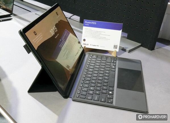 Végül az újdonságok között harmadikként ott a PZ13, mely egy táblagép, lecsatolható, mágnesen rögzülő billentyűzettel, hátulról kihajtható támasztékkal. Fontos különbség az előbbi két újdonsághoz képest, hogy ez Snapdragon X Elite-et használ. Ha valakinek a két évvel ezelőtti ROG Flow Z13 ugrana be, akkor az nem véletlen, a koncepció hasonló, csak a célközönség más, na meg ugye a hardver, mely az említett SoC mellett 16 GB RAM-ot és 1 TB háttértárat tartalmazhat.