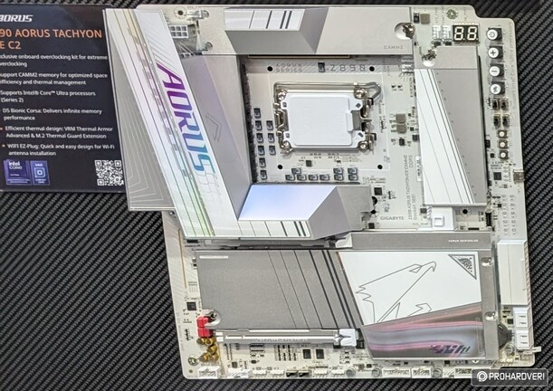 Az inteles oldalon a különlegességet a Z890 AORUS Tachyon ICE CAMM2 képviselte, amely notebookba szánt DDR5-ös rendszermemóriát képes fogadni. Ez a szabvány eleve képcsatornásra van tervezve, tehát elég egyetlen egy modult használni, amelynek az effektív órajele 10 GHz is lehet.