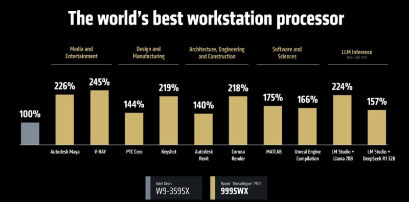 Az AMD szerint az új Ryzen Threadripper sorozat minden szempontból a legjobbnak számít a piacon a maga kategóriájában, ami valószínűleg igaz, mert ehhez a cégnek az előző generációs Ryzen Threadrippereket kellett legyőzni. A Computexen a vállalat a Ryzen Threadripper PRO 9995WX-et összeeresztette az Intel leggyorsabb, munkaállomásokba szánt processzorával, a Xeon w9-3595X-szel, de mivel utóbbi több egy viszonylag koros dizájnra épít, ennek valós jelentősége nem volt, elvégre az Intel ezen a területen nem versenyez egy ideje.