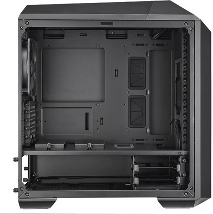 Bár a ház mérete a nagyobb testvérhez képest csökkent, azért a 467 x 235 x 505 mm-es kiterjedés így sem nevezhető kicsinek. Emiatt még mindig meglehetősen tágasnak mondható a belső, és a kornak megfelelő szerelhetőség is adott a vásárlóknak. Az 5,25 hüvelykes meghajtókról a Cooler Master már lemondott, de két 3,5 hüvelykes és két 2,5 hüvelykes rekeszt még rejt a ház, és ezeket kiegészítik az előlap mögé és a hátlapra felszerelt 14 cm-es ventilátorok. Opcionálisan persze további szélgépek helyezhetők el elöl és felül.