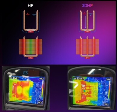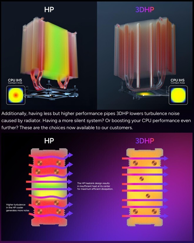 Ez valójában annyit tesz, hogy a fekete aluminumbodázatot egy extra hővezető cső nyársalja fel középen, ráadásul az vaskosabb az átlagnál, szóval a termék két ilyen, 8 mm-es átmérőjű 3DHP csővel érkezik, amelyeknek belsejében variálodó textúrázottság és változó mélységű csatornák találhatók, ezzel specifikus feladatra optimalizálva a különböző szegmenseket. A brosúra szerint ez a dizájn a hőellenállás csökkentése mellett javítja a hőcserét, ezért az újdonság felveszi a versenyt a több hőcsővel szerelt, ám hagyományos megoldásokkal, miközben a fizikai méreteinek kordában tartásával pozitívan befolyásolja a RAM-/házkompatibilitást.