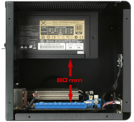 Két PCI bővítőrést kínál a ház, ide akár egy komolyabb teljesítményű videokártya is illeszthető, ennek hosszát 180 mm-ben maximalizálta a gyártó. A házba állítva egy normál méretű ATX tápegység is befér, ekkor azonban a CPU-hűtő legnagyobb magassága 80 mm-re zsugorodik. Alapesetben a beltér szellőztetését csak a gazdagon perforált oldallap segíti, aktív hűtést nem kapott, ez igény esetén hátulra 4 x 40 mm-es ventilátorral oldható meg, ezek az alaplap és a tápegység között tornyosulhatnak katonás rendben.