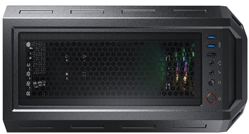 Az I/O panel szokás szerint az egyébként méretes szellőzőráccsal is ellátott tetőlemezen keresendő, itt a bekapcsológomb mellett két-két USB 3.0 és 3,5 milliméteres jack csatlakozó, illetve egy USB 2.0 port sorakozik.