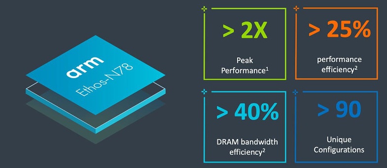 Az Ethos-N78 fő fejlesztése az elődnek számító Ethos-N77-hez képest, hogy egységnyi területre levetítve 25%-kal jobb hatékonyságot kínál, vagyis kisebb lapkaterületbe építhető bele ugyanaz a teljesítmény, ami eléggé fontos tényező, de persze az is lényeges, hogy elméletben dupla akkora számítási tempó érhető el az új generációs IP-vel. Emellett az ARM külön dolgozott azon, hogy kímélhessék a memóriaalrendszert, így a friss fejlesztés ebből a szempontból 40%-kal is jobb lehet az elődjénél.