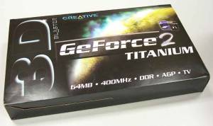 A kártya tűzpiros!! Ez a szín pedig (részben) az MSI-é, és a kártyát közelebbről szemügyre véve ezt igazolhatjuk is magunknak: egy az egyben az MSI GeForce2 Titanium kártyájáról van szó, azzal az apró különbséggel, hogy lehagyták róla a TV-bemenetet. A Creative tehát nem sokat kockáztat (korábban a Visiontek kártyáival csinálta ugyanezt), hanem megvesz egy kész kártyát, rányomja, hogy "Creative" (minő kreativitás!), oszt mehet a boltokba x% haszonnal