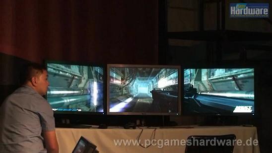 Habár a Cry Engine 3-at a készítők főleg konzolokhoz készítették, az ATI Cypress kódnevű Radeon HD 58xx kártyáján futó PC-s bemutató láttán kijelenthetjük, hogy ugyanaz a bemutató pálya, amit konzolokon már láthattunk korábban, PC-n legalább olyan szépen fest - ha nem szebben. Az Eyefinity prezentációja három 27" képátlójú Full HD-s monitoron zajlott, 5760x1200-as felbontásban. Ugyebár az Eyefinity egy többmonitoros megjelenítési technológia, mellyel extrém felbontásokban játszhatjuk majd a jövő játékait. És ehhez semmiféle különleges hardverre nincs szükségünk, csak egy - vagy több - HD 58xx VGA-ra és monitorokra.