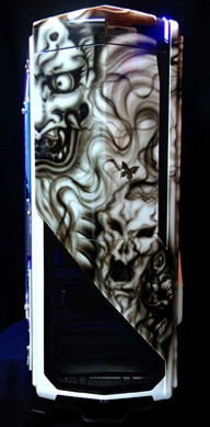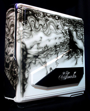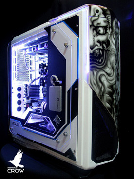Elejét és oldalát gyönyörű, füstös, koponyás, hollós air-brush festés díszítik. Másik oldalán hatalmas, egyedi ablak enged szabad rálátást a nagyszerűen sikerült belsőre. Természetesen vízhűtésről van szó, amiben a ház többi eleméhez hasonlóan a fekete és fehér szín dominál.