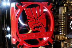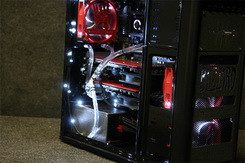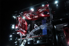 Nem csak a ház teteje kapott egyedileg kivágott panelt, de minden egyes ventilátorrács is különböző, ezek a játékban választható karakterekre utaló motívumokat ábrázolnak. A rendszerben egyébként egy 4,1 GHz-re tuningolt AMD Phenom II X6 (1090t) processzor, 16gb Corsair Vengeance memória (2133 MHz) és két darab GeForce GTX 460 SLI-be kötött videokártya lakik, mindez egy ASUS Crosshair V Formula alaplapba ültetve. A folyadékhűtés átalakított Corsair rendszerekből áll, a videokártyákon például egy-egy Corsair H70 zárt vízhűtés lapul saját készítésű felfogatóval. Érdemes még megemlíteni, hogy még a videokártyák hátlapja is egyedi tervezés, és sok más alkatrésszel egyetemben tűzpiros fényezést kapott.
