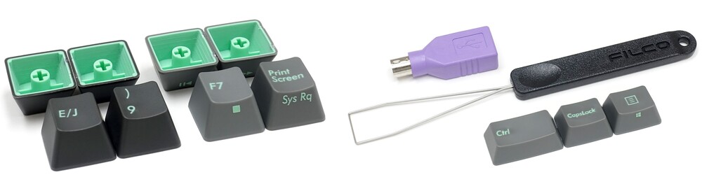 Kiosztás tekintetében 104 gombos US ASCII és 108 gombos japán, továbbá 87 gombos US ASCII és 91 gombos japán szerepel a menün, de az utóbbiak billentyűsapkáira nem kerültek fel hiragana/katakana karakterek. Szerencsére a lebegő dizájnt sem erőltették, és az NKRO-s tasztatúrák extra funkcióit a megszokott módon, azaz Fn + [gomb] kombinációkkal érhetjük el. A dőlésszög két szinten állítható, és gumitappancsokból nem csupán az alsó borítás négy szélére, hanem a kihajtható lábakra is jutott.