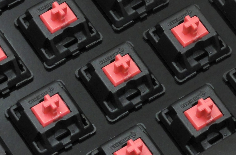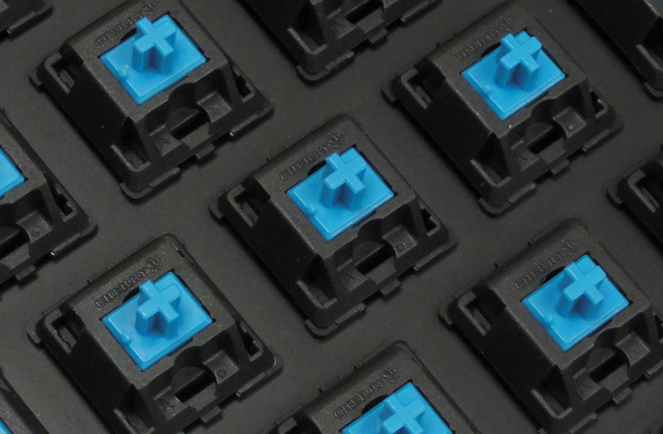 A gusztusosan szürkéskék (zöld?) felső burkolattal érkező megoldások kettős fröccsöntéssel készített, két tónusban tetszelgő PBT kupakjai alá kattogós/taktilis Cherry MX Blue, taktilis/halk Cherry MX Brown, lineáris Cherry MX Red, valamint ugyancsak lineáris, ám halkabb, némileg rövidebb úton járó és puhább ("mushy") Cherry MX Silent Red kapcsolókat választhatunk.