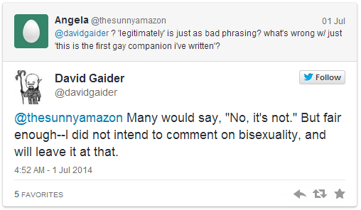 A Dragon Age: Inquisition esetében egy bajuszos mágus, Dorian lesz az első olyan csapattársunk, akivel kizárólag csak férfiként kezdhetünk romantikus viszonyt. A BioWare történelmében ő lesz a legelső, ténylegesen meleg férfi csapattárs, akiről a sorozat vezető írójának, David Gaidennek lehetősége van írni. Erről be is számolt a játék hivatalos oldalán, majd nem sokkal utána kénytelen volt finomítani a stílusán, ugyanis a "fully gay" (inkább nem fordítom le) megjegyzés nem tetszett az olvasóknak.