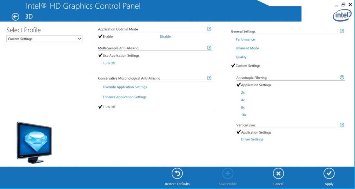 Az Intel friss meghajtójában a CMAA alapértelmezetten ki van kapcsolva, és két mód van az aktiválására. Az egyik az alkalmazás beállításainak kiterjesztése (enhance), amely szimplán bekapcsolja a CMAA-t az éppen beállított grafikai szinthez. A másik opció a beállítások felülírása (override). Távol álljon tőlünk, hogy bárki véleményét befolyásoljuk (nyugodtan ki lehet próbálni mindkét változatot), de a CMAA aktiválásakor célszerűbb a felülírást választani. Ennek az oka csupán az, hogy számos mai program eleve használ valamilyen beépített utófeldolgozáson alapuló élsimítási eljárást, és ennek az eredményén nem feltétlenül célszerű még CMAA-t is futtatni. A felülírásra vonatkozó beállítás a CMAA alkalmazása esetén megpróbálja letiltani a program által használt utófeldolgozáson alapuló élsimítási beállításokat, annak érdekében, hogy csak a CMAA legyen aktív.