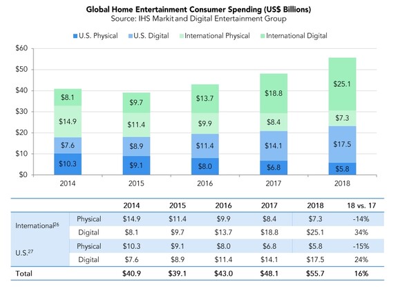 Az Amerikai Mozgókép Szövetség (MPAA) több piackutató cég, például az IHS Markit riportjai alapján összeállította fizikai adathordozókon forgalmazott filmekre is vonatkozó éves jelentését. Ebből kiderült, hogy a tavalyi évben tovább folytatódott e formátum hanyatlása. Az Egyesült Államokban 15, míg a világ többi részén 13 százalékkal csökkent az eladott vagy kölcsönzött DVD és Blu-ray korongokból származó bevétel.