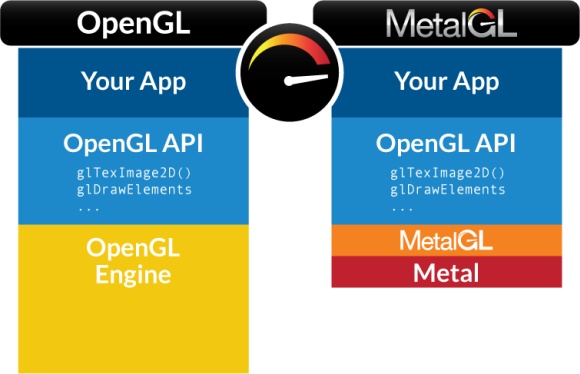 Sok fejlesztő azonban nem szeretné átírni az OpenGL ES 2.0-ra írt alkalmazását, és a Brenwill Workshop emiatt hívta életre a MetalGL-t, amely azzal az ígérettel kecsegtet, hogy az aktuális OpenGL ES 2.0-s kódokat begyorsítja. Természetesen szó sincs arról, hogy az így újrafordított programok teljesítménye elérné a natívan Metal API-ra írt elméletileg lehetséges teljesítményszintet, de a tesztek alapján számos helyzetben valóban érezhető gyorsulást lehet összekaparni lényegében a meglévő kód komolyabb módosítása nélkül.
