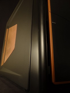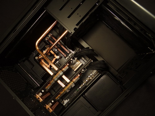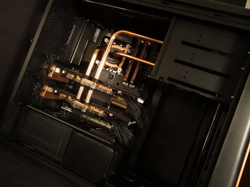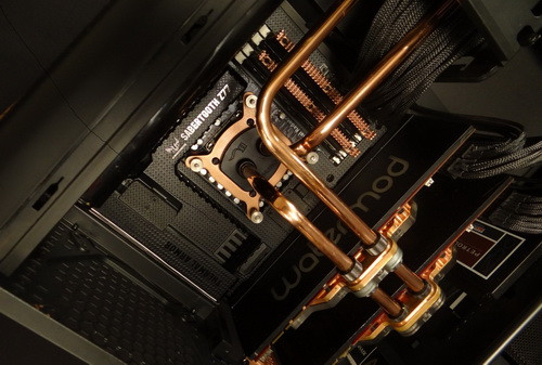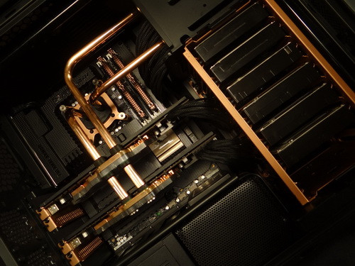 Belsejében ezek után nem meglepő, hogy egy olyan folyadékhűtést találunk, amelyben az alkatrészeket nem tömlők, hanem precízen hajtogatott rézcsövek kötik össze. A hűtés egyetlen körből áll, amely a processzor mellett a két videokártya hűvösen tartásáért felel. Az egységes összképet segíti a moddolt gépekben egyre gyakrabban alkalmazott ASUS Sabertooth szériás alaplap, amelynek hőpajzsa az aktuális környezethez igazítható. A Z77-es deszkában egyébként egy Intel Core i7-2700K processzor lakik Corsair Dominator GT 2133 memóriamodulok társaságában, ezen kívül két Gainward GeForce GTX 285 2 Go VGA-kártya, egy 64 GB-os OCZ Petrol SSD és számos merevlemez sorakozik a rendszerben, a táplálást pedig egy 700 wattos CORSAIR AX PSU végzi. A vízhűtésben 240 mm-es Black Ice GTS radiátor és EK Supreme CPU-blokk figyelhető még meg.