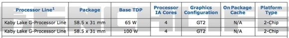 A friss adatok alapján kétféle processzor épülhet majd a fejlesztésre. Mindkettőben négy darab processzormag, illetve egy GT2-es kategóriába sorolt IGP található, viszont az egyik 65, míg a másik 100 wattos TDP kerettel rendelkezik. Ezek a mobil igényeket figyelembe véve első olvasásra soknak tűnhetnek, de valójában nem azok, mivel a TDP keret a processzorra, az IGP-re és a dedikált GPU-ra együttesen vonatkozik, és egy mai notebookon belül sincs a három komponensnek az összesített fogyasztása az említett értékek alatt, főleg úgy, ha kiemeljük, hogy a processzorrész itt négymagos.