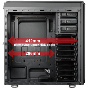 A 8 fiók két részbe van rendezve, így az egyik négyes szükség szerint kiszerelhető. Ez ajánlott mindazok számára, akik 286 mm-nél hosszabb grafikus kártyát akarnak gépükbe építeni – kiszerelve ugyanis akár 412 mm-ig terpeszkedhetünk. A széles kialakítás jót tett a processzorhűtőkkel való kompatibilitásnak is, ezekből 185,3 mm magas darabok is beszerelhetők, ráadásul az alaplaptálca másik oldalán is több hely áll rendelkezésre a kábelek elvezetésére. Természetesen ennek értelmében a megfelelő kábelbújtató réseket, valamint szerelőablakokat sem spórolták ki a házból.