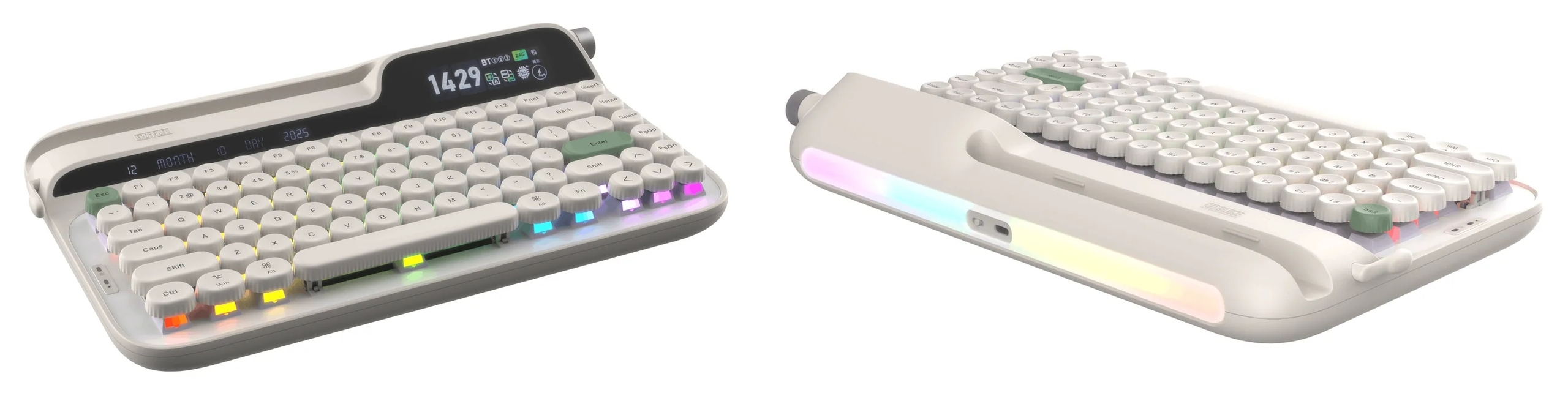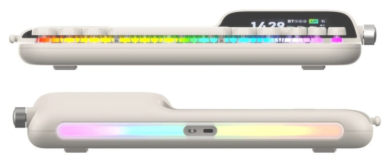 Az US ANSI kiosztású, hátulján vaskos, variálható fénycsíkot viselő apparátus jobb felső sarkában egy színes, 2,7 hüvelykes okoskijelző nyert elhelyezést, amelynek egzakt képességeit egyelőre nem részletezték, mindenesetre a publikáltakból az leszűrhető, hogy az eszközzel kapcsolatos, fontosabb információkat biztosan meg tudja jeleníteni. E képernyőt a tőle jobbra eső oldalsó szekción megtelepedett, multifunkciós tárcsával vezérelhetjük, míg átellenesen egy soremelő kart mintázó kallantyú található, ami felfelé bökve entert, lefelé pedig backspace-t aktuál. A kettő között még egy megjelenítő fut keresztbe, amin a képek tanúsága szerint a pontos dátumot követhetjük nyomon, viszont erről nem igazán említ semmit a brosúra.