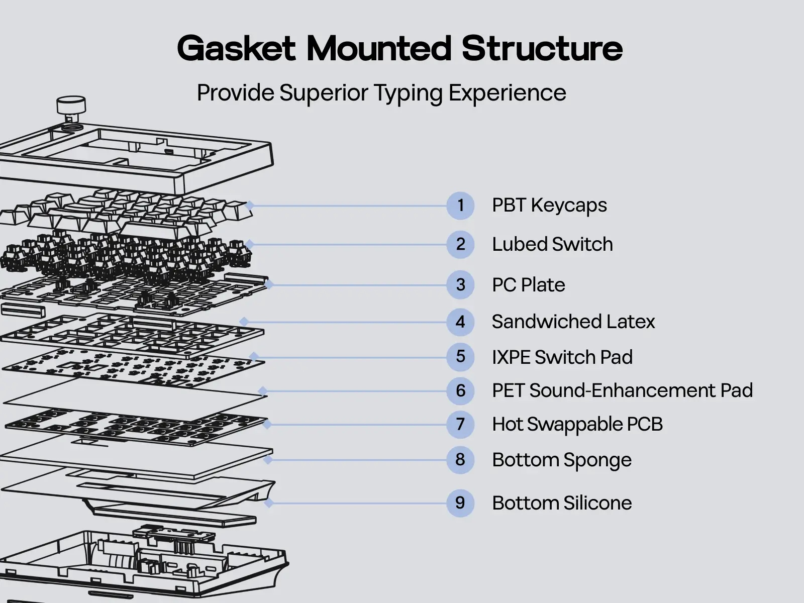 A 70 százalékos dizájnt követő konstrukció a manapság igen népszerű gasket mountot kapta, és gyorscserés fogalalataiban alapból lineáris karakterisztikájú, kenésen átesett Epomaker Wisteria Linear V2 kapcsolók (45/62 gf, 3,6/2 mm, 5 pin, fénydiffúzor) telepedtek meg, amelyeknek szárain Cherry profilos, hőtranszferes technikával feliratozott (dye-sub) PBT kupakok trónolnak.