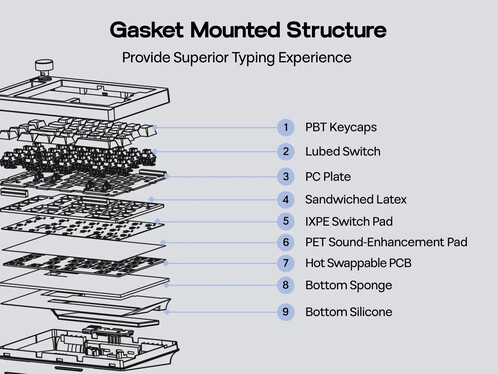 A billentyűsapkák értelemszerűen nem eresztik át a déli tájolású, gombonként címezhető RGB LED-ek fényét, és a lubrikált stabilizátorok a hajlékony/rugalmas polikarbonát plate-be kapaszkodnak. Az ABS plasztikból lévő készülékházakban öt rétegnyi csillapítás tolja a mélyebb tartományok felé a gépelési hangot, miközben megszünteti az esetleges kongást/pengést, de cserébe csökkenti a plate-ből és mountból fakadó flexet (lásd alul).