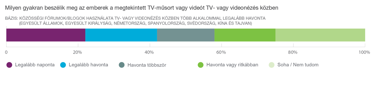 A kutatásból kiderül, hogy a fogyasztók 62 százaléka heti rendszerességgel látogat közösségi oldalalkat TV-nézés közben – ez a tavalyi adatokhoz képest 18 százalékos növekedés. Ez a fajta párhuzamos médiahasználat a nők 66, a férfiak 58 százalékára jellemző, a fogyasztók negyede rendszeresen meg is vitatja a közösségi oldalakon a látottakat.