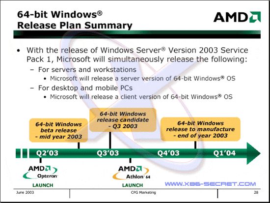 Az AMD ütemtervéből kitűnik, hogy a redmondi vállalat a Windows Server 2003-hoz kibocsátandó első javítócsomag megjelenésével egyidejűleg, a harmadik negyedévben jelenteti meg az AMD 64-bites CPU-it támogató operációs rendszerének első RC-verzióját. Így tehát az Athlon 64 debütálásakor már egy majdnem teljesen kész Windows XP is fellelhető lesz. A Windows XP és a Windows Server 2003 teljes mértékben "AMD 64-bites processzor-kompatibilis" változatai 2003 végére, 2004 elejére készülnek majd el. A Windows Server 2003-ból jelenleg két verzió létezik: az egyik a 64-bites Intel Itanium, míg a másik a 32-bites x86 processzorokat támogatja.