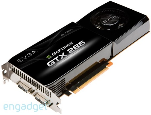 Pár hónappal a PC-s verzió bemutatása után az NVIDIA az EVGA-t bízta meg a GeForce GTX 285 modell Mac gépekbe helyezhető változatának gyártásával. A termék alapját az 55 nm-es technológiával gyártott GT200 lapka képezi, mely 240 stream processzorral és 80 textúrázó csatornával dolgozik. A kártya 648, 1476 és 2484 MHz-es mag-, shader- és effektív memória-órajelen üzemel, ami megfelel az NVIDIA ajánlásának. A GDDR3 szabványra épülő fedélzeti memória pedig 1 GB kapacitású lesz.