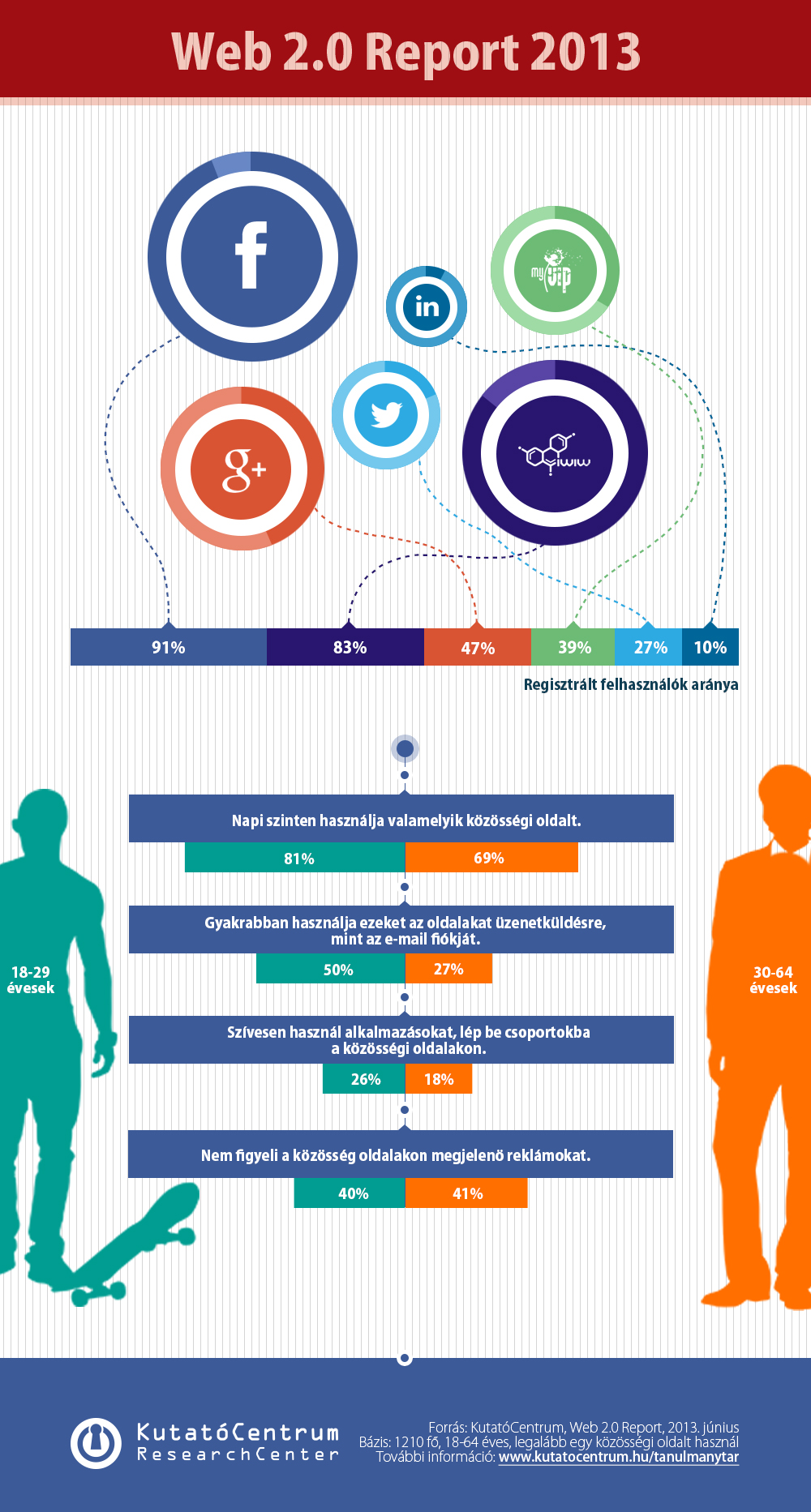 Továbbra is a Facebook a legnépszerűbb közösségi portál, mivel a KutatóCentrum felmérése szerint a legalább egy hasonló felületen regisztrált internetezők 91 százaléka tagja a Facebooknak is. Ugyanakkor az adatok szerint a korábbi évekre jellemző lendületes növekedése megtorpant, sem a regisztrált, sem az aktív tagok aránya nem változott nagyságrendileg. „Más közösségi oldalakkal szemben a Facebook erőssége, hogy tagjainak döntő többsége (94,5%-a) aktív felhasználó – emelte ki Györke Zsuzsanna, a KutatóCentrum kutatási projekt menedzsere. – Ezzel szemben az iWiW egyébként is alacsony aktív tagjainak aránya egyharmadával csökkent, míg a MyVIP esetében felére esett vissza egy év alatt.”