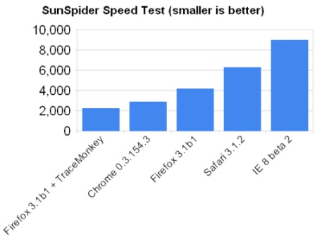 A fejlődés látványos. A CNET mérése szerint a SunSpider tesztet a TraceMonkey-val erősített Firefox 3.1 nyeri (ha nincs aktiválva az új motor, a futtatás kétszer annyi időt vesz igénybe) 2257 ms-os eredménnyel. Hasonló teljesítményt a vizsgált mezőnyből egyedül a Chrome nyújt, a Safari és az Internet Explorer 8 messze le van maradva – és egyébként (ez nem látszik a grafikonon) velük teljesít egy mezőnyben a jelenlegi stabil Firefox-verzió, a 3.0.3 is.