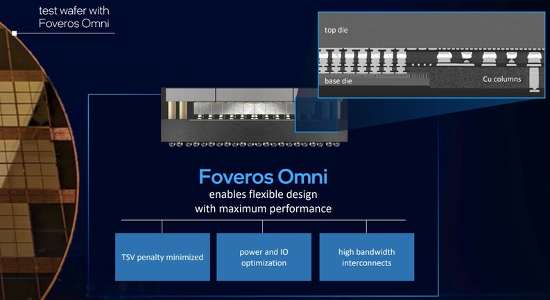 A Foveros Omni leginkább a két generációt is megélt eredeti Foveros továbbfejlesztésének fogható fel. Az előnye, hogy a felső lapka nem az alsón keresztül kapja az energiát, hanem direkten a tokozásról, az alsó lapka melletti összeköttetéseken keresztül. Ez egyrészt flexibilisebb tervezést tesz lehetővé, másrészt nagyobb teljesítmény biztosítható a felső lapka számára, amivel növelhető a Foveros dizájn tempója.