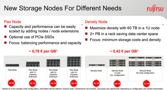 Erre a kihívásra kínál megoldást a Fujitsu ETERNUS CD10000 S2 rendszere. A fizikai adattárolásra két újfajta node-ot fejlesztettek ki. A 2U magas Flex Node elsősorban skálázhatóságban és sebességben remekel, és akár 2 x 800 GB, PCI Express csatolós SSD-vel is megtámogatható; a Density Node pedig adatsűrűségben erős, 1U formátumban, 60 TB tárkapacitással. Teljes, 42 darab Density Node-os felállásban egy rack szekrényben 2,5 PB adat eltárolása lehetséges hozzávetőleg 130 forint/gigabájt fajlagos költséggel, ami a korábbinál egy nagyságrenddel nagyobb adatsűrűséget és egy nagyságrenddel alacsonyabb árat jelent, nem mellesleg feleakkora fogyasztás mellett.