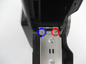 Ha a fenti sorozatszámmal rendelkező terméken az akkumulátorfedél belsejében, az objektívoldalon az alábbi képhez hasonló piros jelölés található, akkor a hibát már elhárították. (A kékkel jelölt rész a már korábban kiderült magenta elszíneződés javítását jelzi.)