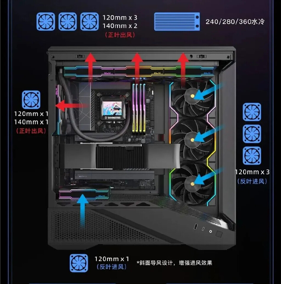 A hardverek hűtésébe nyolc 120 vagy 140 mm-es ventilátor segíthet be, de felül egy 240/280/360 mm-es radiátor is beszerelhető. A fedélzeti konnektorok a bal oldal alsó szegmensébe kerültek, és egy USB Type-C kaput, egy USB 3.2 Gen 1 Type-A aljzatot, plusz egy 3,5 mm-es audio jacket találhatunk itt.