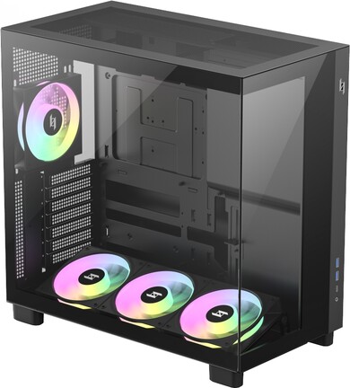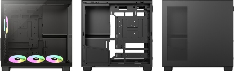 A 435 mm magas, 235 mm széles és 435 mm mély, 7 bővítőhelyes típus szemből, valamint balról edzett üvegpanelekkel határolt belsejében 180 mm magasságú CPU-hűtő, 425 mm hosszúságú, beépített támasztékkal stabilizált videokártya és 160 mm hosszúra nőtt tápegység fér el, az alkatrészek hűtéséhez pedig hét légkavaró asszisztálhat, amelyekből négy, ARGB LED-ekkel megszórt példányt tartozékként megkapunk (három fordított tájolású). Az alul lévő ventilátorkeret dőlésszöge variálható, így a megszokottnál nagyobb kontrollunk van a légáramlatok felett, és a vizes rendszerek gazdái két radiátorban gondolkodhatnak, amelyek közül a felülre költöztetett darab 360 mm-esre nőhet.