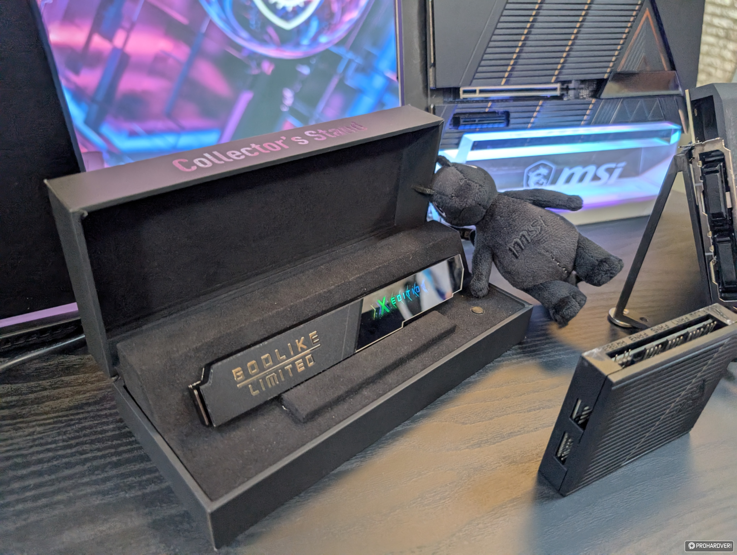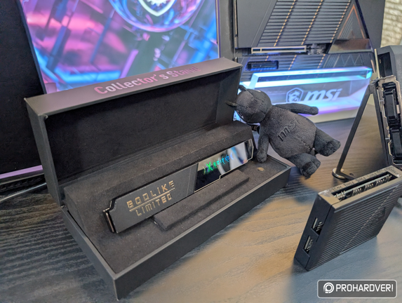 Természetesen egy ilyen alaplapnál kötelező az ARGB világítás meg a színes LCD a bordázaton, így ezek nem is hiányoznak, ahogy a robosztus tápellátás sem: a 110 amperes VRM 24+2+1 kiosztással rendelkezik, a NYÁK lap pedig 2 unciás és tíz rétegű. Merevségét hátlapi, acélból készült takarólemez növeli. A fontosabb extrák között ott van például a Dynamic Dashboard III nevű LCD kijelző, vagy az EZ Link nevű konnektordoboz, mely a memóriafoglalatok előtt helyezkedik el. Ebbe előre beköthetünk egy sor csatlakozót, aztán elrejthetjük az alaplapon elöl vagy mágnesesen hátul, és csak egy speciális vezetéket kell visszahoznunk az alaplap elejére, ezzel csökkentve a kábelrengeteget. Aztán kapunk mellé egy M.2 Xpander-Z nevű bővítőkártyát, amivel két további PCIe 5.0 x4 SSD-t csatolhatunk rendszerünkbe, és ami érdekessége ennek a rendszernek, hogy ezeket szerszám nélkül, egyszerűen a bővítőkártyán kialakított fiókokba betolva rögzíthetjük. Ami a továbbiakat illeti, 10 gigabites hálózati csatlakozóra, Wi-Fi 7-re számíthat az, aki megvásárolja az 1000 darabos széria valamelyik darabját.