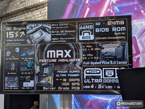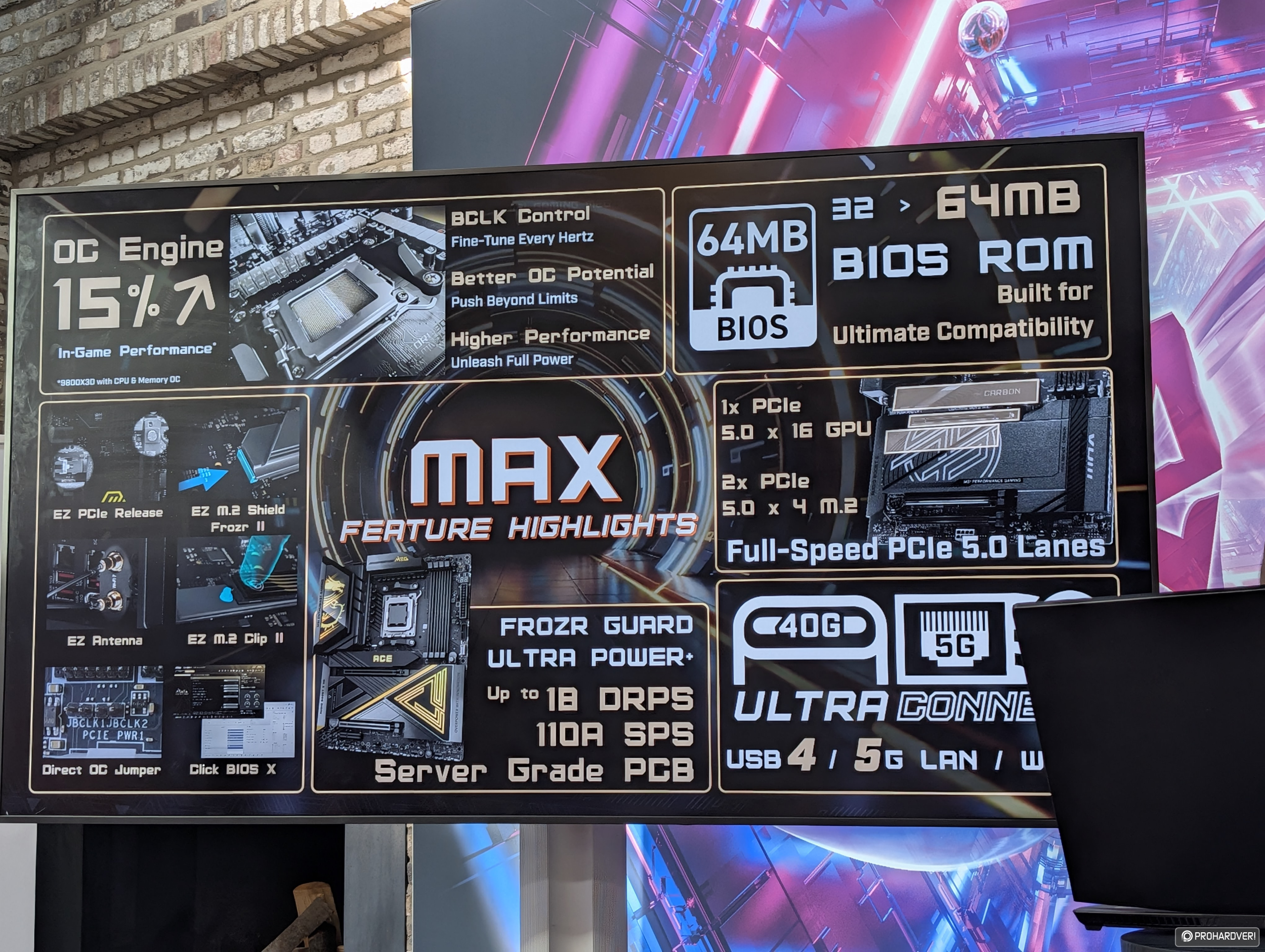 A szélesebb közönség számára elérhető újdonságok között a MAX széria megjelenése a legfontosabb. Ezek már a piacon lévő alaplapok továbbfejlesztései, és egyáltalán nem csak a csúcskategóriában találkozhatunk velük, mert például a MAG X870E Gaming Plus WiFi-ből is készül ilyen, de azért tény, hogy elsősorban a drágább családokba érkeznek. A MAX elnevezéssel az MSI azt szeretné jelezni, hogy ezeknél a modelleknél maximalizálták a teljesítményt, a csatlakozási lehetőségeket és a szerelhetőséget. Kicsit jobban a részletekbe menve, egyrészt 110 amperes, 18+2+1-es kiosztású tápellátást kapunk, 8 rétegű NYÁK-ot és 2x 8 tűs kiegészítő tápcsatlakozást az alaplapra.