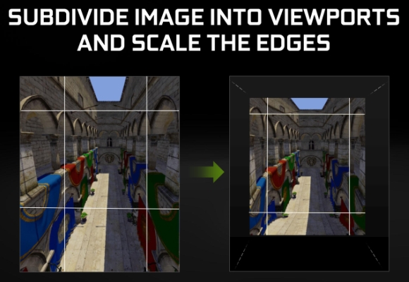 Az Intel ötletéhez képest az NVIDIA megoldása annyiban különbözik, hogy nem a szűréssel babrál, hanem több nézőpontra osztja a képkockát és azokat külön számolja a rendszer. A képkocka közepe lesz a fontos, ami teljes minőségben készül, míg a nyolc szélső nézőpont számítása a natív felbontás felével vagy negyedével is történhet. Utóbbi nyilván tetszőlegesen paraméterezhető.