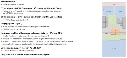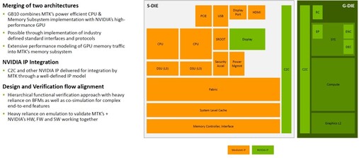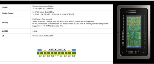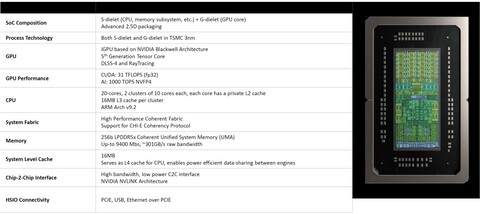 A GPU chipletet az NVIDIA szállítja, amelyben a fabric interfész mellett 6144 CUDA magot tartalmazó, 24 MB-os L2 gyorsítótárat használó grafikus vezérlő található az NVDEC és NVENC nevű dekódoló- és kódolómodulok mellett. A CPU chiplet viszont a MediaTek fejlesztése, és itt található a 256 bites, LPDDR5X-es memóriavezérlő, a 20 darab ARMv9.2-es processzormag, két darab, tízmagos klaszterre osztva, a melléjük társított 16-16 MB-os, azaz összesen 32 MB-os L3, illetve egy 16 MB-os, rendszerszinten megosztott gyorsítótárral. A különböző I/O interfészek is ebbe a chipletbe kerülnek, ahogy az NVIDIA által fejlesztett kijelzőmotor is.