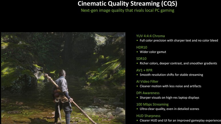 Újdonság a CQS, vagyis a Cinematic Quality Streaming, ehhez igazából a kliens oldalán is nagyon modern gép kell, de ha ez megvan, akkor a kódolt stream minősége egészen kellemes lesz, viszont a lokálisan számolt minőséget nyilván így sem éri el, hiszen tömörítésre van szükség, hogy a képi és hangtartalom a hálózaton hatékonyan továbbítható legyen.