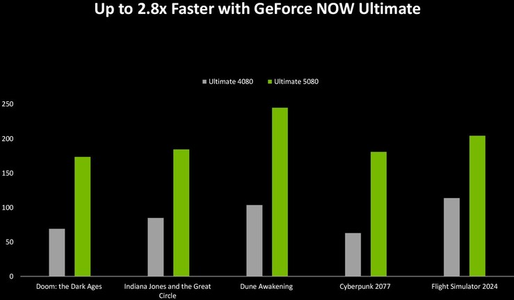 Az új POD Ultimate 5080 néven lesz kérhető, és az NVIDIA belső mérései szerint akár 2,8-szer gyorsabb lehet az Ultimate 4080-hoz viszonyítva, így Full HD mellett elérhetővé válik a másodpercenkénti 360 képkocka igénylése, de ez nem minden játék alatt működik, ugyanis ehhez a módhoz kötelező a Reflex támogatása a futtatott cím oldalán. Arról sem szabad megfeledkezni, hogy az így kapott stream másodpercenként ténylegesen 360 képkockát tartalmaz, ami egyrészt nagy megterhelés az adott internetkapcsolatnak, illetve az egyes kliensek sem feltétlenül tudnak ilyen tartalmakat megfelelő sebességgel dekódolni, vagyis a használat előtt érdemes tájékozódni a helyileg elérhető kliens képességeiről. Nem elhanyagolható módon szükség van 360 Hz-es monitorra is, hiszen felesleges ennyi képkockát kérni, ha a helyben elérhető kijelző nem tudja megjeleníteni.