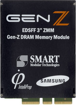 Mindehhez természetesen kellenek a hardverek, és a SMART Modular az idei Flash Memory Summit alkalmával prezentálta az iparág egyik első, DDR4-re épülő Gen-Z memóriamodulját (ZMM). Ebben az SNIA 3 hüvelykes, 4C SFF-TA-1008/9 formátumú fejlesztésben 32 gigabites Samsung memórialapkák dolgoznak, a vezérlésről pedig az IntelliProp lapkája gondoskodik, amely többek között támogat bájt- és blokkszintű memória-hozzáférést, továbbá 16 darab Gen-Z sávot biztosít összesen 400 Gbps-os elméleti maximális tempó mellett.
