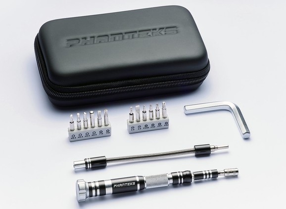 A 16 darabos szettben 12 darab bitfej (2, 2,5, 3 és 4 mm-es imbusz, T15-ös és T20-as Torx, PH00, PH0, PH1 és PH2 méretű keresztélű (Philips) csavarhúzó, 5 mm-es dugókulcs, illetve 2 és 4 mm-es lapos csavarhúzó), egy teleszkópos és egy hajlékony szár, illetve egy 8 mm-es imbuszkulcs található. Mindez elég ahhoz, hogy a Phanteks kínálatában szereplő bármilyen alkatrész összeszerelésével megbirkózzunk, ide értve a vízhűtés komponenseit is.