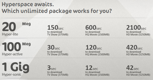 Egyelőre három szimmetrikus – le- és feltöltési irányban azonos sávszélességet biztosító – csomagot hirdettek meg 20 és 100 megás, illetve 1 gigás maximális sebességgel. Az ígéretek szerint mindegyik konstrukció korlátlan adatforgalmat foglal magában, és forgalommenedzsmentet sem alkalmaznak. Az árakról egyelőre nem esett szó.