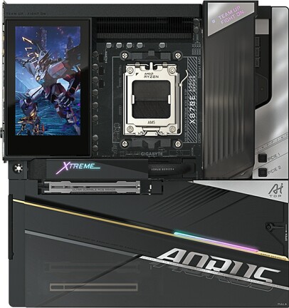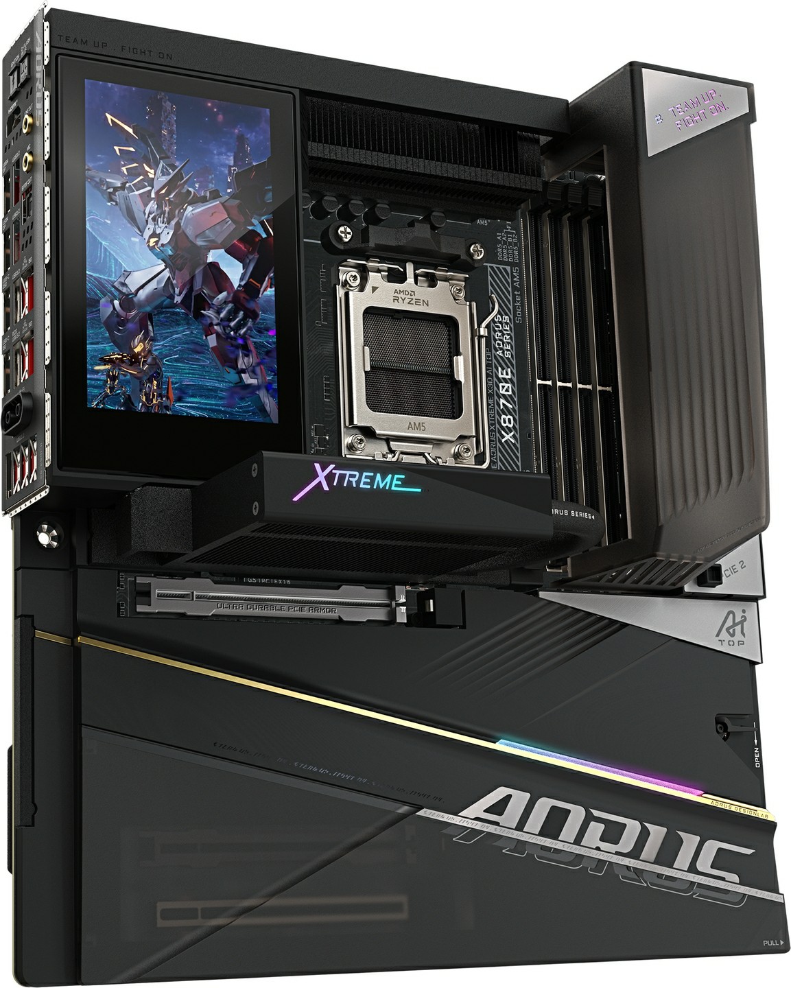 Az AMD X870E vezérlőhídra épülő, E-ATX-es megoldás brutális, 24+2+2 fázisos VRM-jén két hővezető csővel (az egyik 8, a másik pedig 6 mm-es átmérőjű), illetve 12 W/m-K hővezetési tényezőjű termál padokkal kiegészített alumíniumbordázatok trónolnak, a fix I/O pajzsnál lévő példány tetején pedig egy 5 hüvelykes, testreszabható Edge View LCD kijelző nyert elhelyezést. Az integrált Wi-Fi drivert tartalmazó, 512 Mbites AMI UEFI BIOS-szal érkező modell négy DIMM slotjába legfeljebb 256 GB-nyi, túlhajtással 9000 MHz-es effektív órajelre konfigurált DDR5 memóriát rakhatunk, és ezek hűtéséről az 50 mm-es ventilátorral szerelt DDR Wind Blade XTREME modul, valamint a feszültségszabályzó áramkörök hűvösen tartását is segítő CPU Thermal Matrix dizájn gondoskodik.
