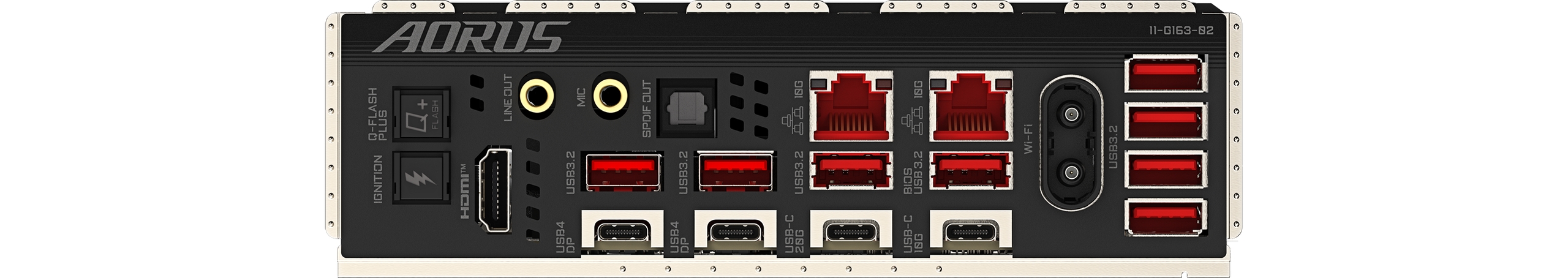 A szellőzőrésekkel perforált hátlapon egy Q-Flash Plus gomb, egy extrém tuning esetén hasznos OC Ignition gomb, egy HDMI 2.1 TMDS kimenet, két DisplayPort alt módos USB4 Type-C csatoló, egy USB 3.2 Gen 2x2 kapu, egy USB 3.2 Gen 2 Type-C interfész, nyolc USB 3.2 Gen 2 Type-A csatlakozó, két antenna konnektor, két – 3,5 mm-es – audio jack és egy optikai hangkimenet állomásozik a két LAN-on kívül. Gépházunk előlapjára egy 65 wattos Power Delivery 3.0/Quick Charge 4+ gyorstöltésre képes USB 3.2 Gen 2x2 Type-C, négy USB 3.2 Gen 1 Type-A és négy USB 2.0 port költöztethető ki.